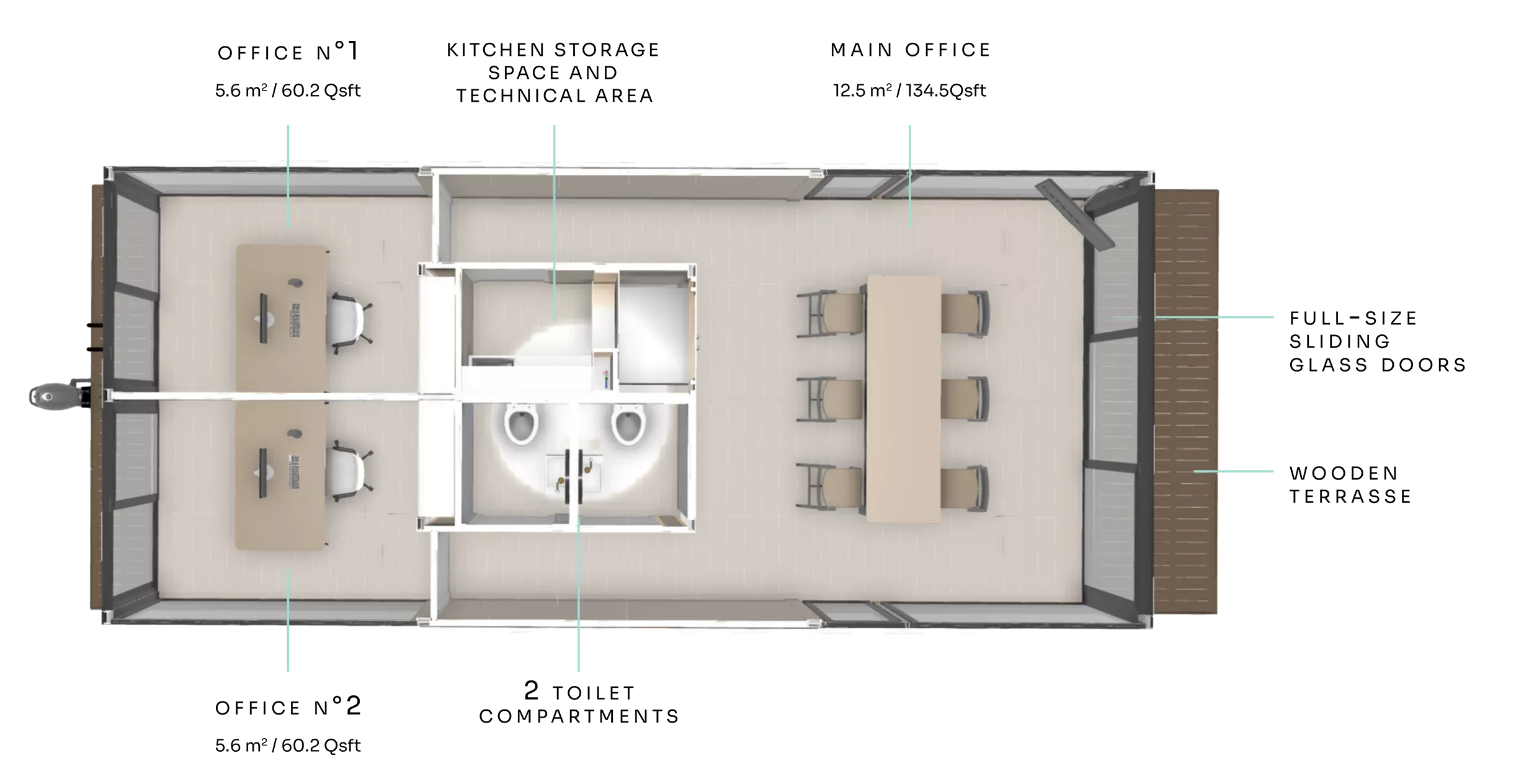 The Office configuration includes two individual workspaces and one larger main office, all designed for focus or professional meetings. Each area can be customized as a workstation, a private office, or a collaborative space. A wooden terrace naturally extends the work environment, ideal for informal conversations or client meetings outdoors. The rooftop can host a pergola, lounge area, or solar panels. Modules can be combined to create a fully tailored business hub.
